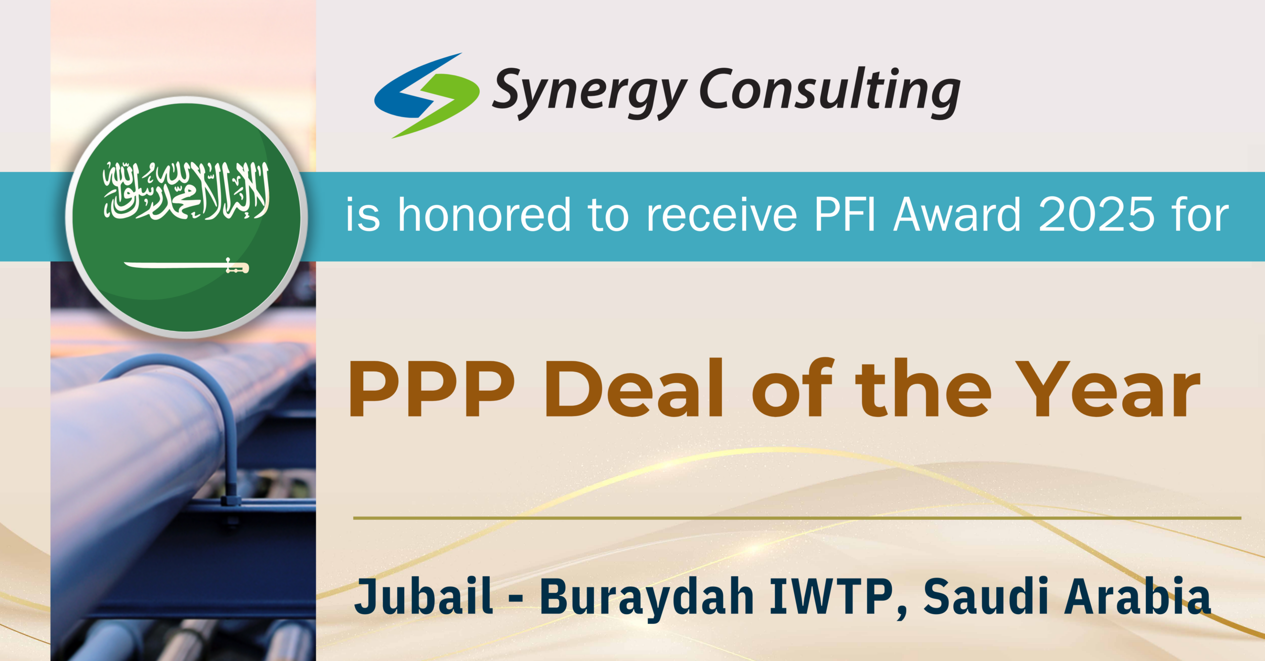 Synergy Consulting, Inc. is honored to have served as the Financial Advisor to the procurer Saudi Water Partnership Company (SWPC) for achieving Financial Close of the Jubail Buraydah IWTP in Kingdom of Saudi Arabia – which has been recognized with the prestigious PFI Award 2025 for “PPP Deal of the Year”.