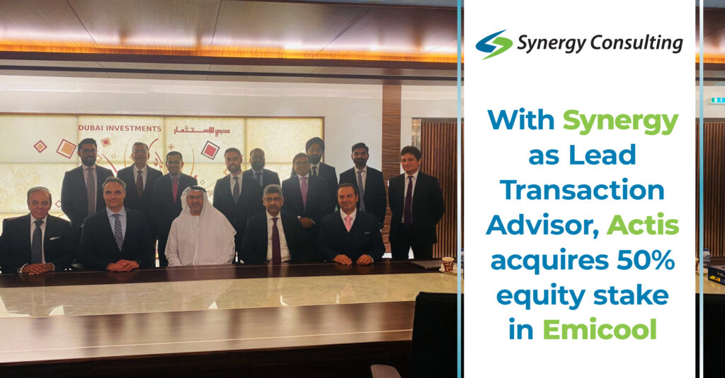 Synergy Consulting is honored to be the Lead Transaction Advisor to Actis, for the acquisition of 50% stake in Emicool. Dubai Investments, the leading diversified investment company and currently the 100% shareholder of Emicool entered a deal to divest a 50% stake to Actis – a leading global investor in sustainable infrastructure, at a corporate valuation of AED 3.7Bn (US$1Bn) and equity valuation of AED 2.4 Bn (US$ 653Mn). With an extensive network in multiple geographies, the Joint Venture (JV) is aimed at supporting Emicool in its vision towards becoming one of the leading providers of sustainable and efficient District Cooling services in the wider MENA region.