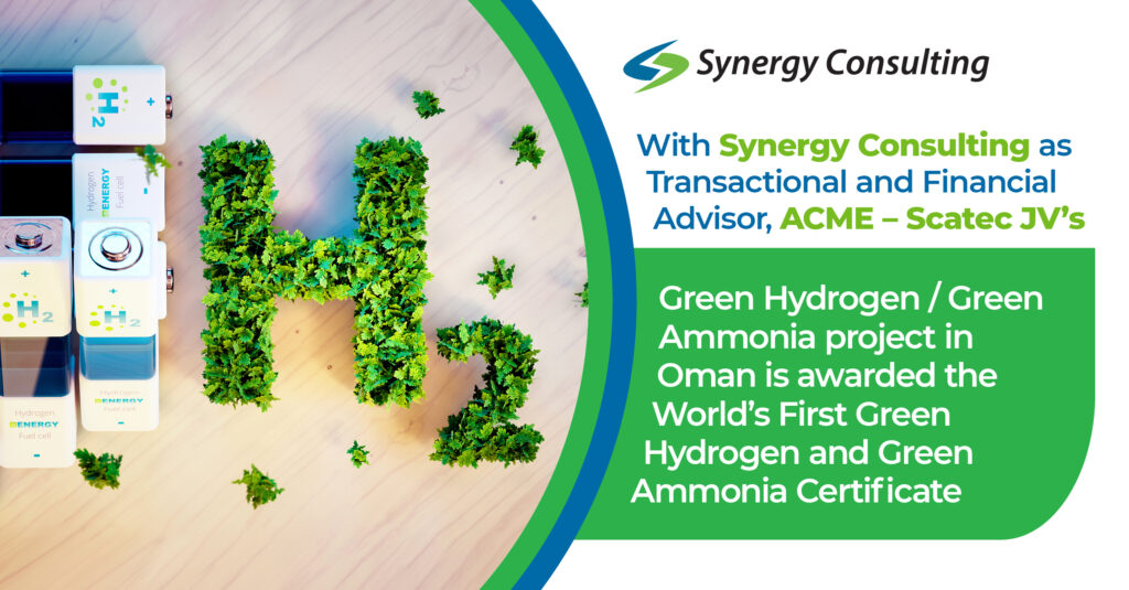 With Synergy Consulting as Transactional and Financial Advisor, ACME – Scatec JV’s Green Hydrogen / Green Ammonia project in Oman is awarded the World’s First Green Hydrogen and Green Ammonia Certificate