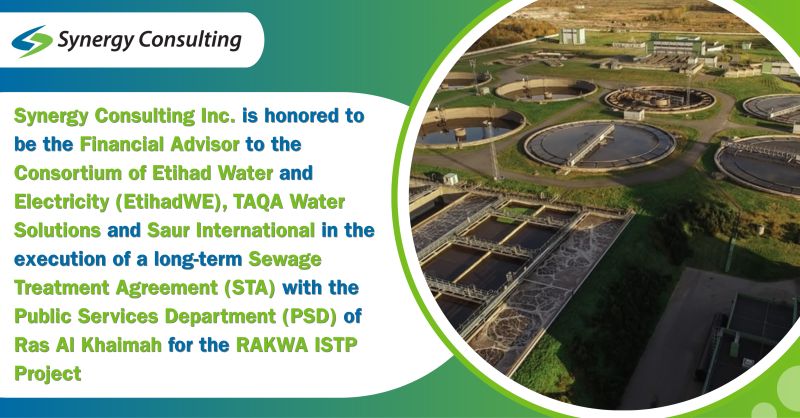 Synergy Consulting, Inc. is honored to be the Financial Advisor to the Consortium of Etihad Water and Electricity (EtihadWE), TAQA Water Solutions and Saur International in the execution of a long-term Sewage Treatment Agreement (STA) with the Public Services Department (PSD) of Ras Al Khaimah for the RAKWA ISTP Project, Ras Al Khaimah’s first large-scale wastewater PPP project, delivered under a BOOT framework.